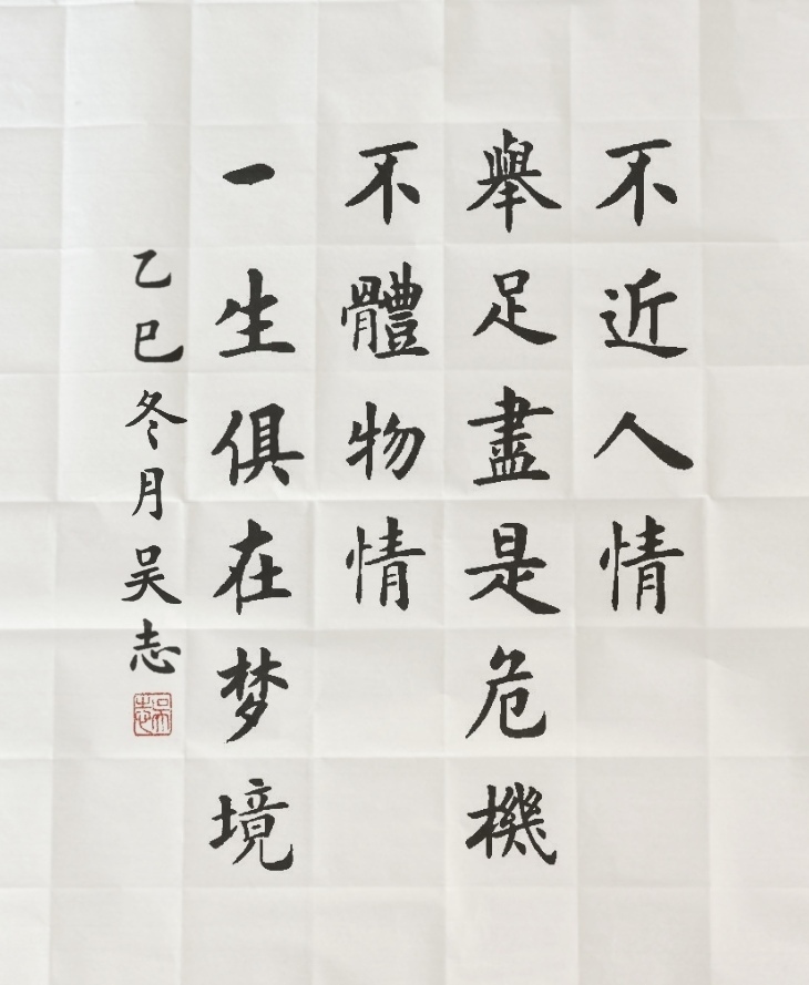 吴志,男,1977年出生,中共党员,吴志的书法深受钟繇、虞世南、欧阳询、颜真卿、柳公权、赵孟頫等前辈大家的影响。博采众长,在用笔和布局上进行了前所未有的创新尝试。对于比例的精准控制、转折的精妙处理,以及字组和章法的精心安排,都开辟出了全新的路径。正因如此,欧楷、柳楷、颜楷的笔画和笔意特征在其字中皆有迹可循。吴志遍访当代名家,作品触合卢中南,等老师之笔意精华,大气磅礴、潇洒倜傥,其字形俏俊飘逸,字里行间蕴含着强烈的视觉美感与内在韵味。