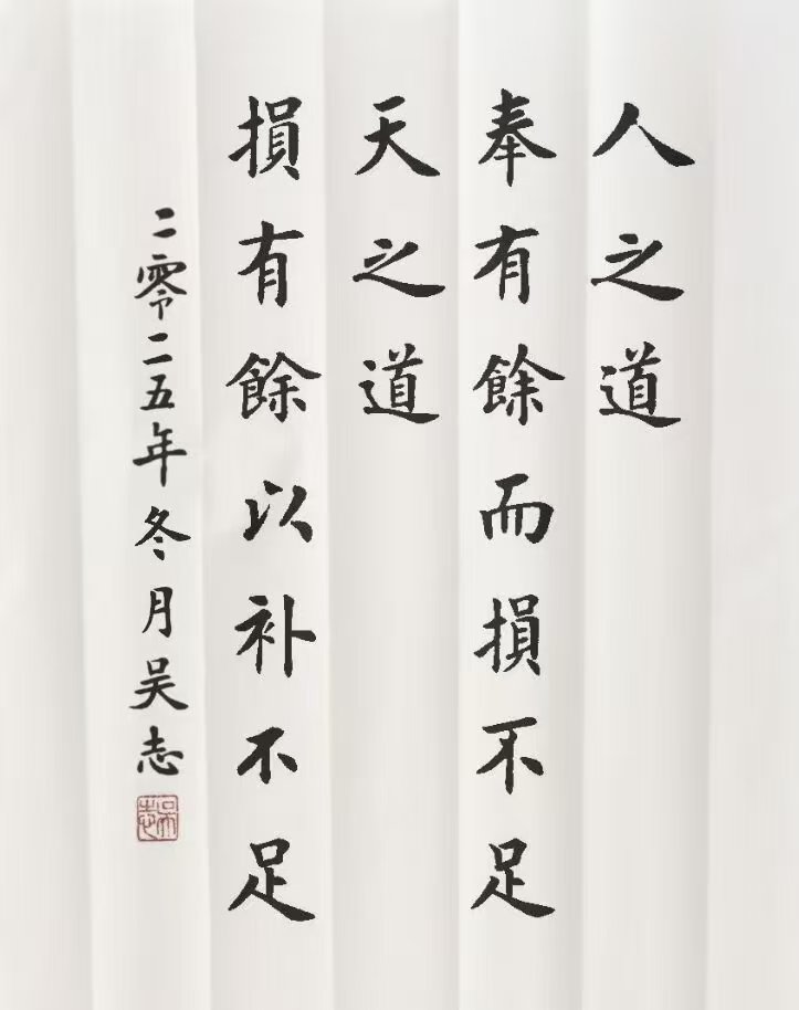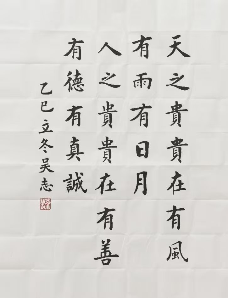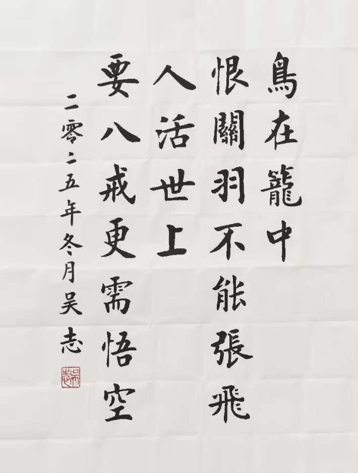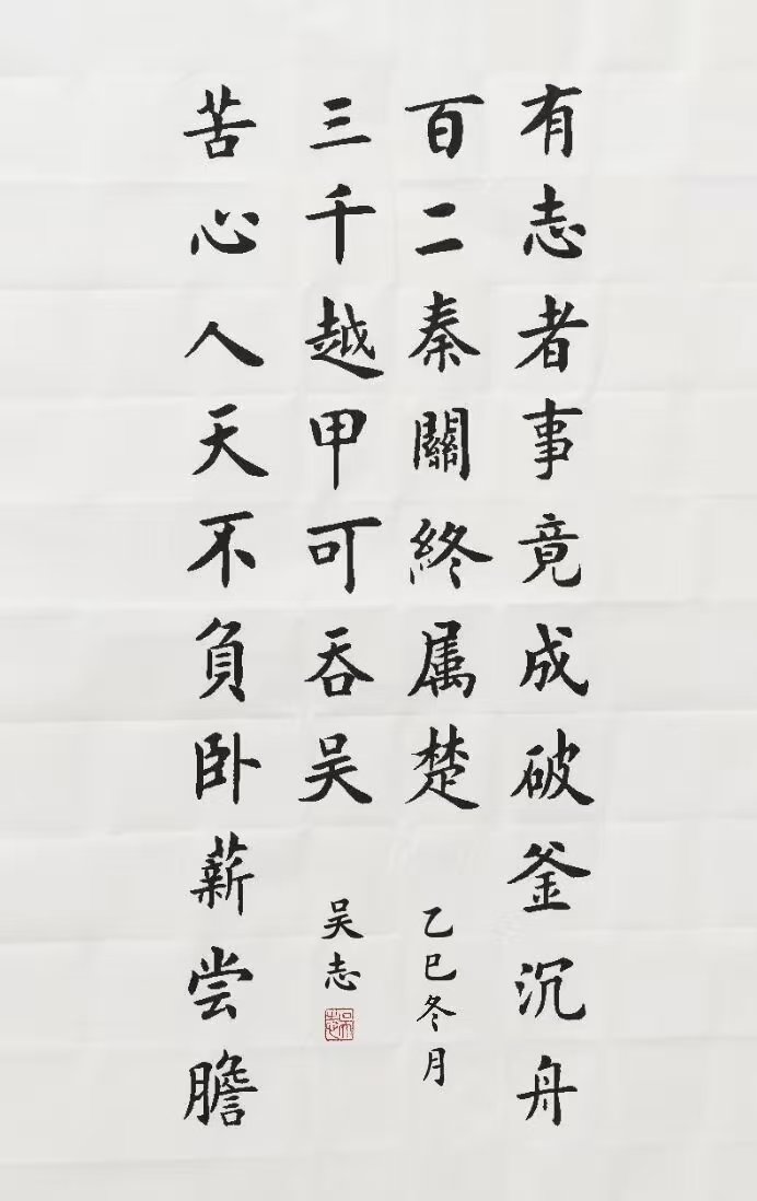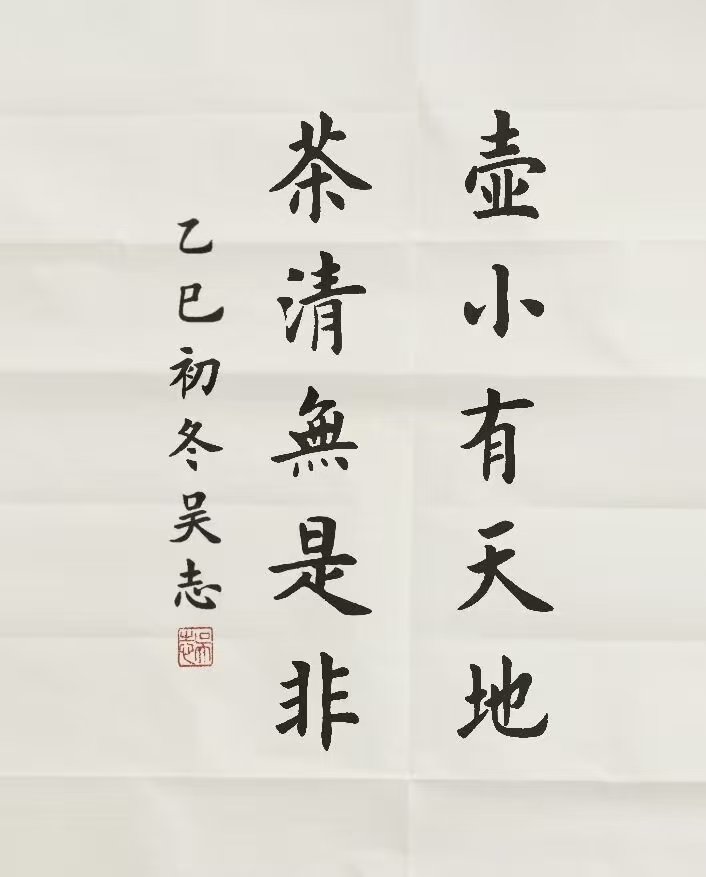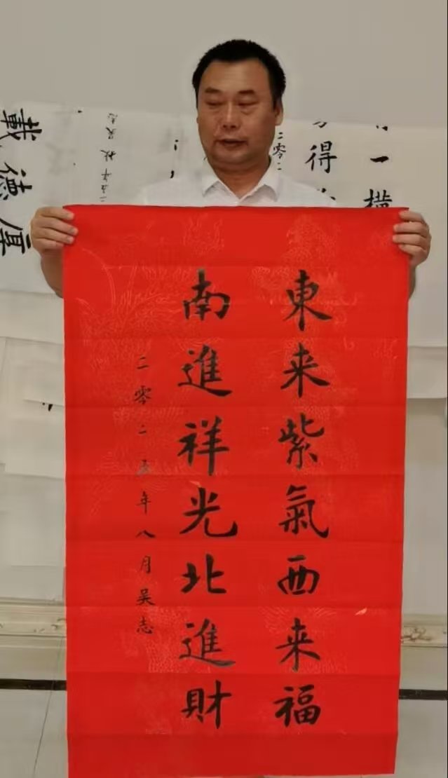 吴志,男,1977年出生,中共党员,吴志的书法深受钟繇、虞世南、欧阳询、颜真卿、柳公权、赵孟頫等前辈大家的影响。博采众长,在用笔和布局上进行了前所未有的创新尝试。对于比例的精准控制、转折的精妙处理,以及字组和章法的精心安排,都开辟出了全新的路径。正因如此,欧楷、柳楷、颜楷的笔画和笔意特征在其字中皆有迹可循。吴志遍访当代名家,作品触合卢中南,等老师之笔意精华,大气磅礴、潇洒倜傥,其字形俏俊飘逸,字里行间蕴含着强烈的视觉美感与内在韵味。